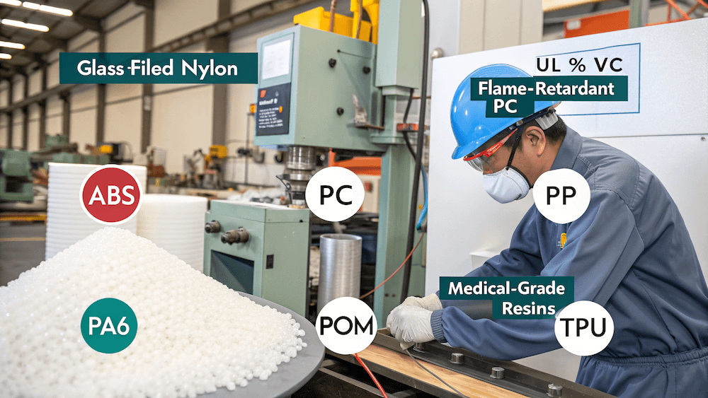 Common materials include ABS, PC, PP, PA6, POM, and TPU. For specialized uses, materials like glass-filled nylon, UL 94 V-0 flame-retardant PC, or medical-grade resins may be required.